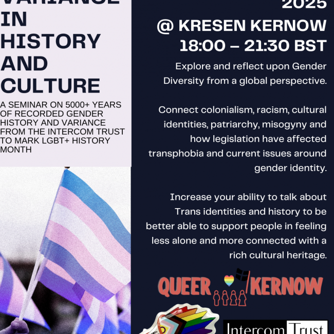 We are excited to say that next Gender Variance in History and Culture seminar will be on Thursday 20th February at Kresen Kernow from 18:00 – 21:30. The seminar will cover o