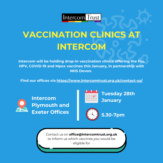Intercom will be holding drop-in vaccination clinics offering the Flu, HPV, COVID-19 and Mpox vaccines this January, in partnership with NHS Devon. You can find full details of eli