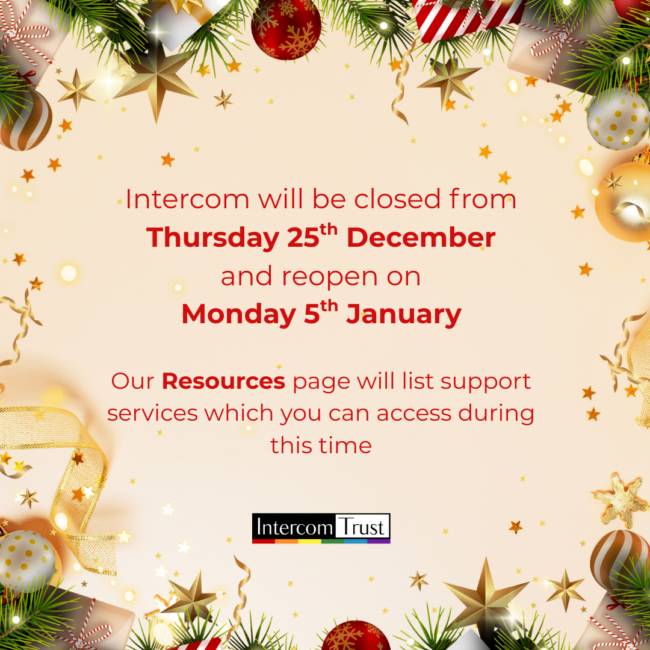 Intercom will be closed from Thursday 25th December and reopen on Monday 5th January. During this time the Helpline (calls and emails) will not be answered and staff will not have access to their emails. Our Resources page will list support services which you can access during this time, and you can also look at our Directory for information on local LGBT+ support and social groups which may be running over the festive period.